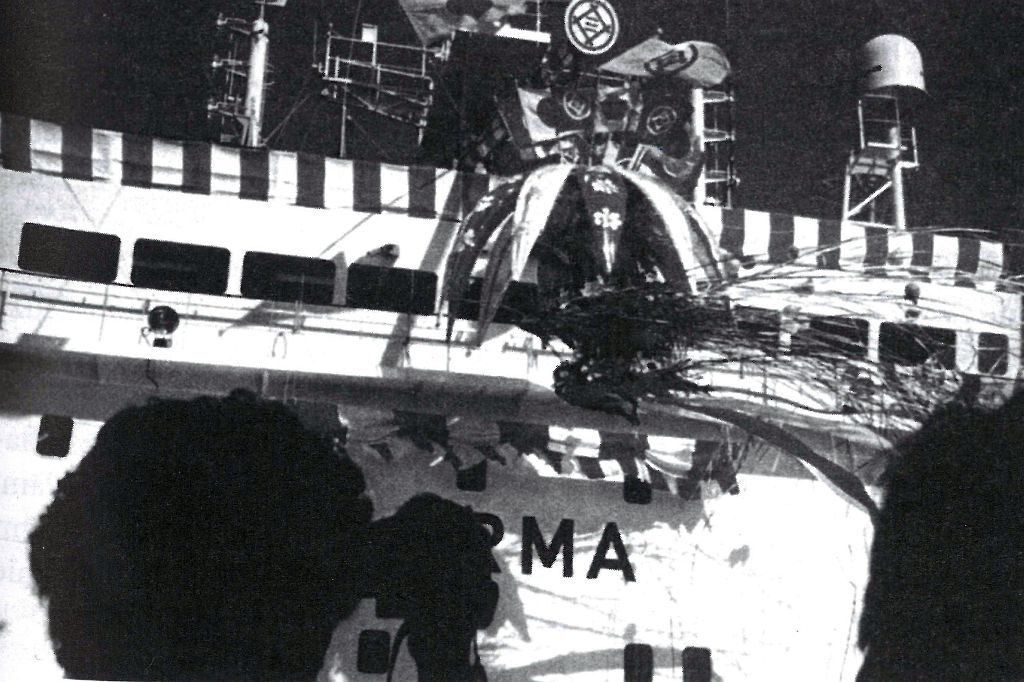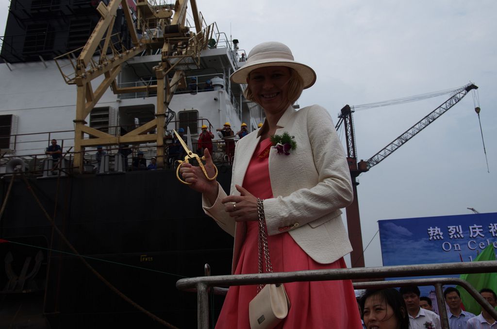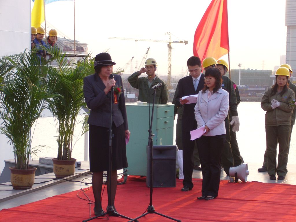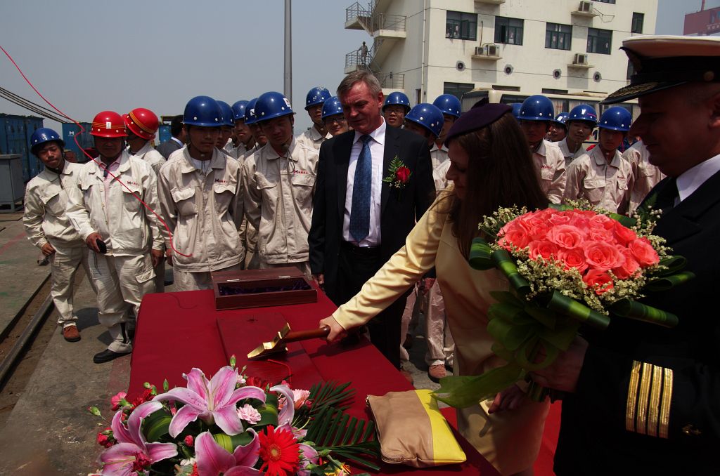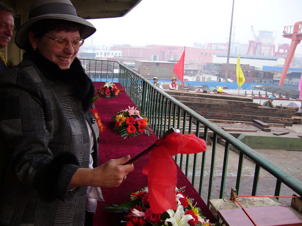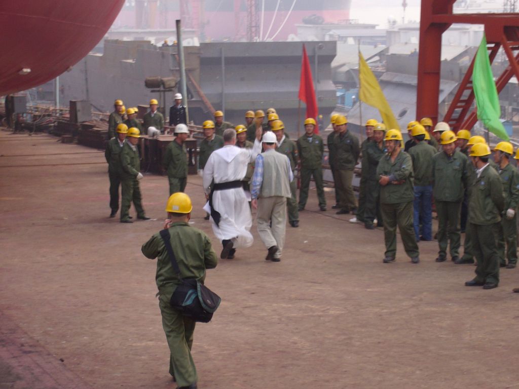 Tak wygląda część świecka uroczystości Chrztu statku, po której następuje uroczystość chrześcijańska. Zaproszony kapłan po krótkiej modlitwie Chrzci wodą święconą najpierw statek, a następnie zgromadzonych gości i stoczniowców.