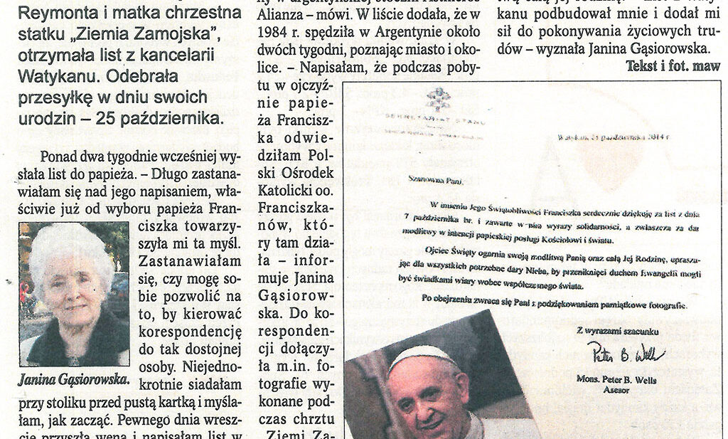 List z Watykanu Janinna Gąsiorowska z Zamościa, Matka Chrzestna statku Ziemia Zamojska otrzymała list z kancelarii Watykanu. Odebrała przesyłkę w dniu swoich urodzin – 25 października.