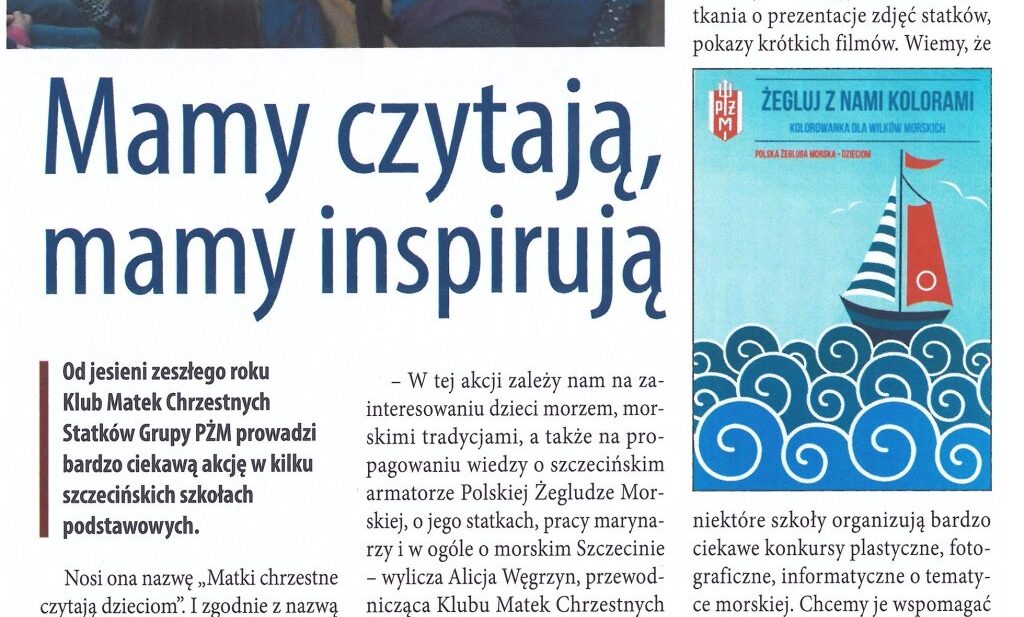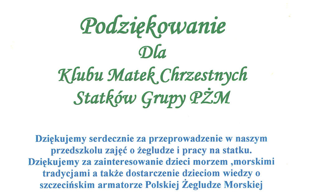 Spotkania z dziećmi Jednym z celów działalności Matek Chrzestnych mieszkających w różnych regionach Polski jest propagowanie wśród dzieci i młodzieży wiedzy o morzu, statkach, pracy marynarzy i armatorze. Jedną z aktywniejszych Matek Chrzestnych w tym wymiarze działalności jest Janina Gąsiorowska,