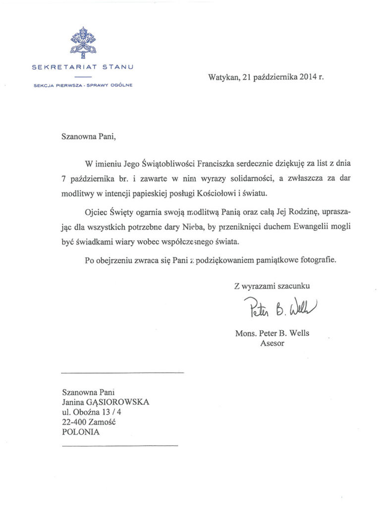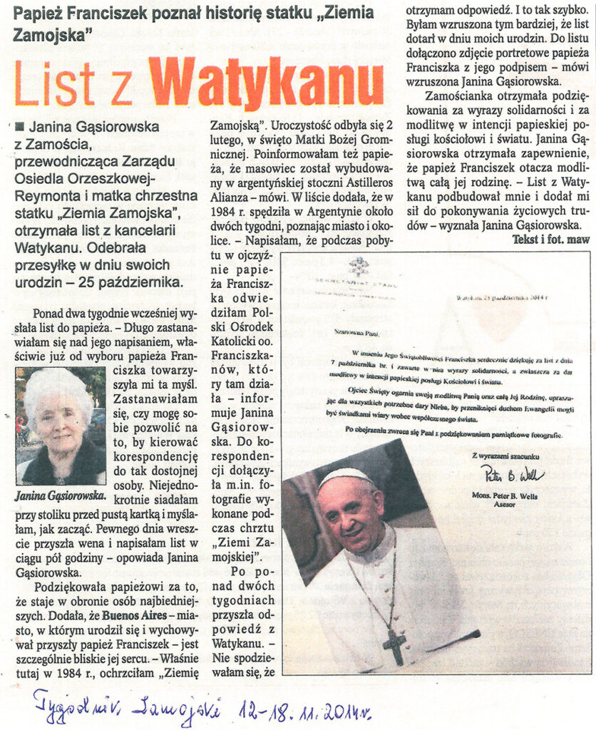 Janinna Gąsiorowska z Zamościa, Matka Chrzestna statku Ziemia Zamojska otrzymała list z kancelarii Watykanu. Odebrała przesyłkę w dniu swoich urodzin – 25 października.