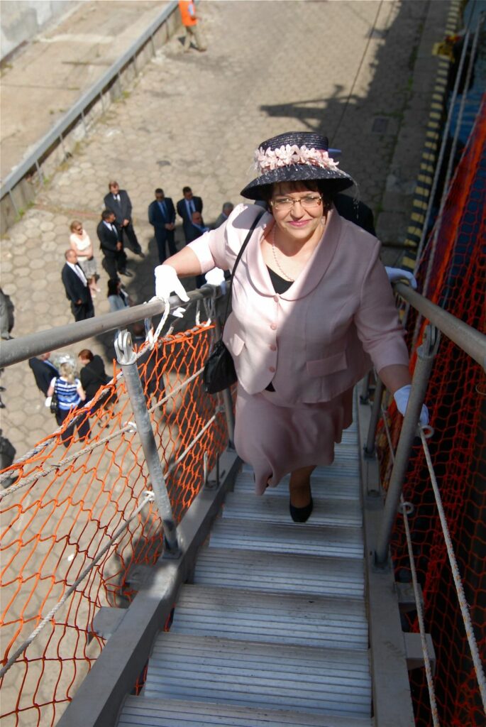 Chrzest statku z jego pokładu czasem stanowi duże wyzwanie dla Matki Chrzestnej. Przebycie drogi na statek przybiera różne formy. Wejście po wysokim trapie w butach na obcasach, stanowiących atrybut kobiecości to wyczyn godny podziwu. Bywało, że na statek dostawałyśmy się „windami – kapsułami”.